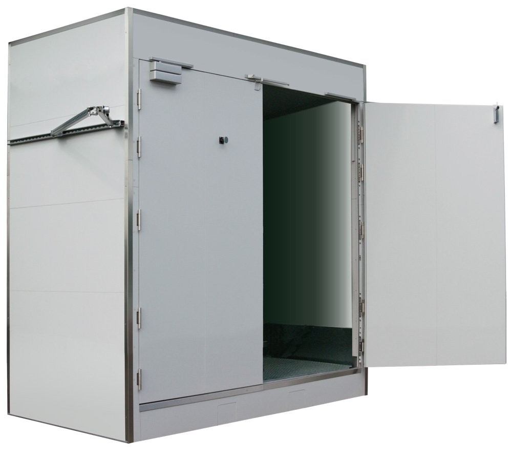 İki adet IBC konteynerinin ve palet üzerinde altı adet 200 litrelik varilin depolanması için uygun,DIN 18095 ile uyumlu duman geçirmez özellikli 90 dakika boyunca yangına dayanıklı kimyasal saklama kabini